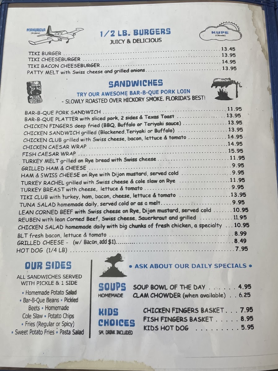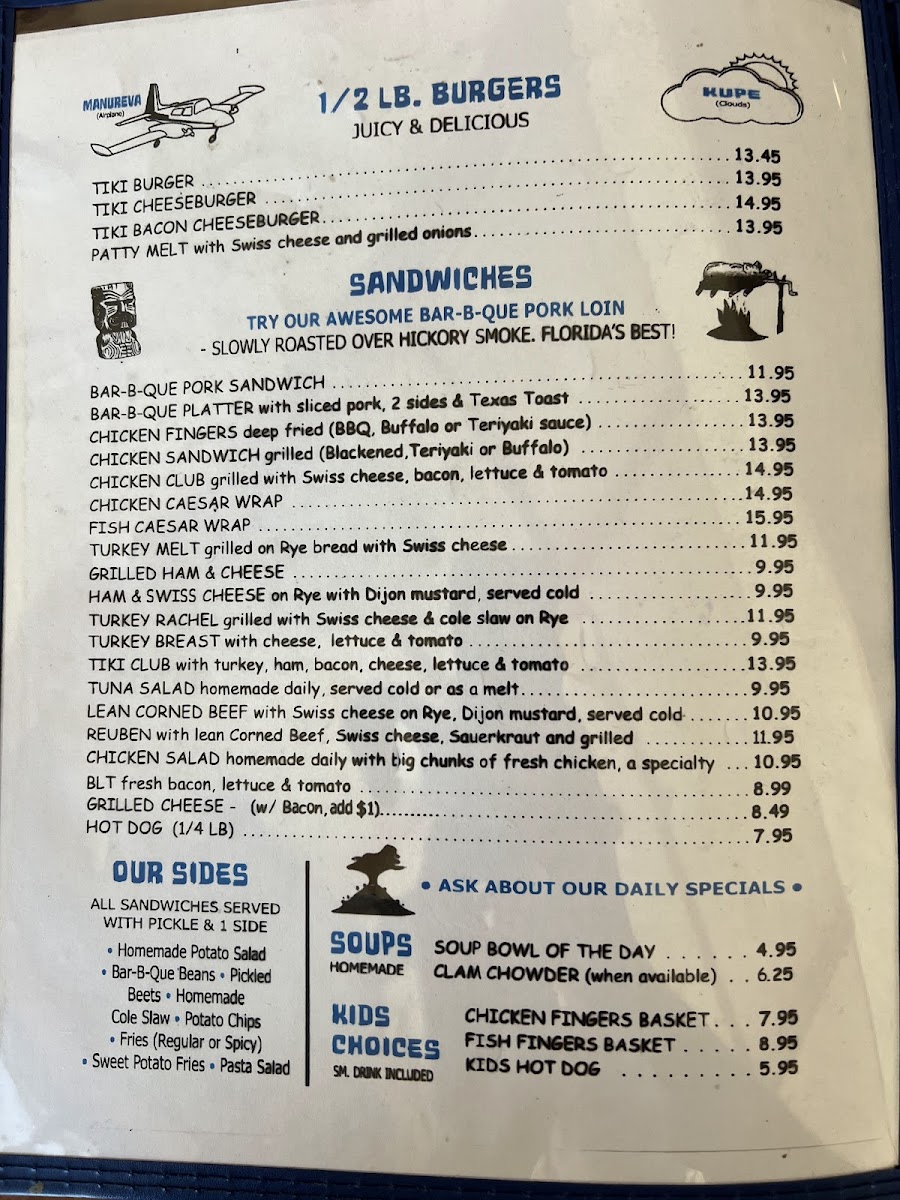 Welcome to Airport Tiki, a charming American restaurant nestled at the heart of Fort Pierce, FL. Located conveniently at 2982 Curtis King Blvd, this hidden gem has quickly captured the hearts of locals and travelers alike. With a menu that balances comfort and creativity, you can expect generous options that cater to all palates.